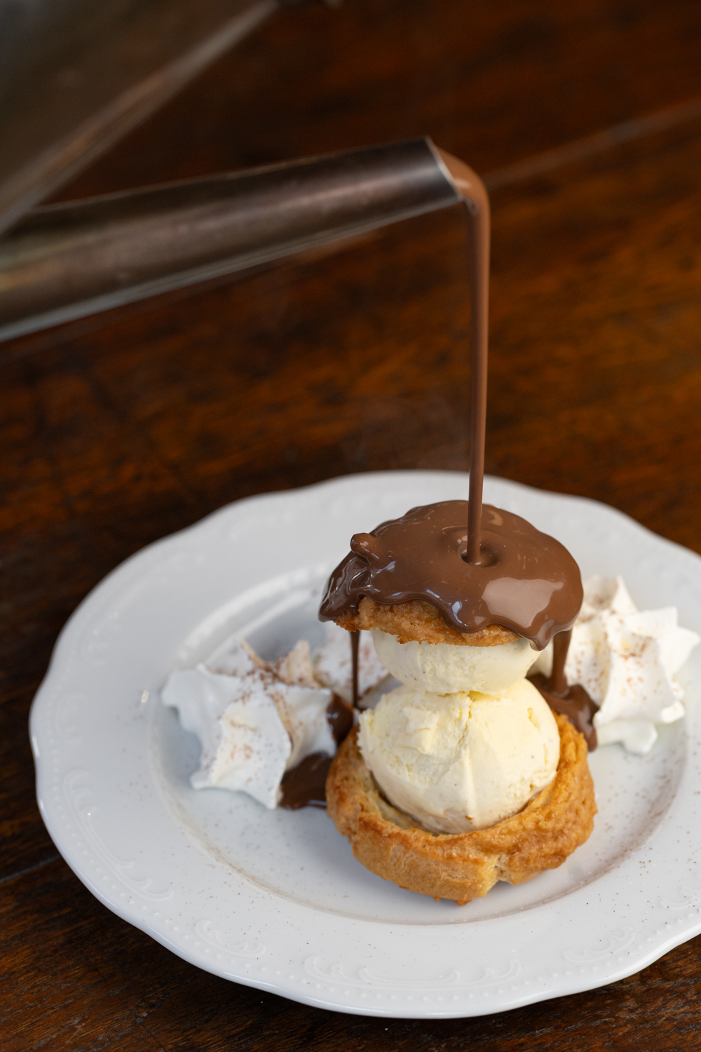 Conclure le repas avec une grosse profiterole maison nappée « minute » de chocolat.