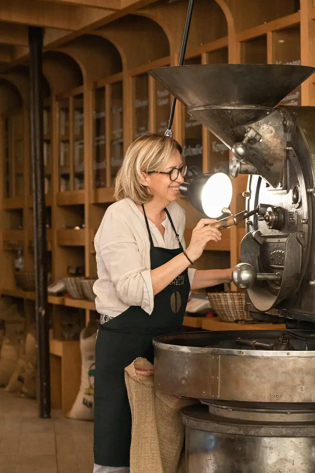 L’antique brûloir à gaz, cœur vivant et odorant situé à l’entrée de la boutique.