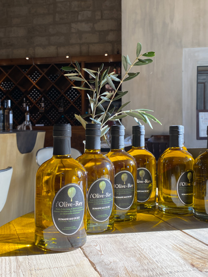 Les huiles d’olive du domaine, un fruité vert plein de finesse et un « fruité noir » avec maturation à l’ancienne.