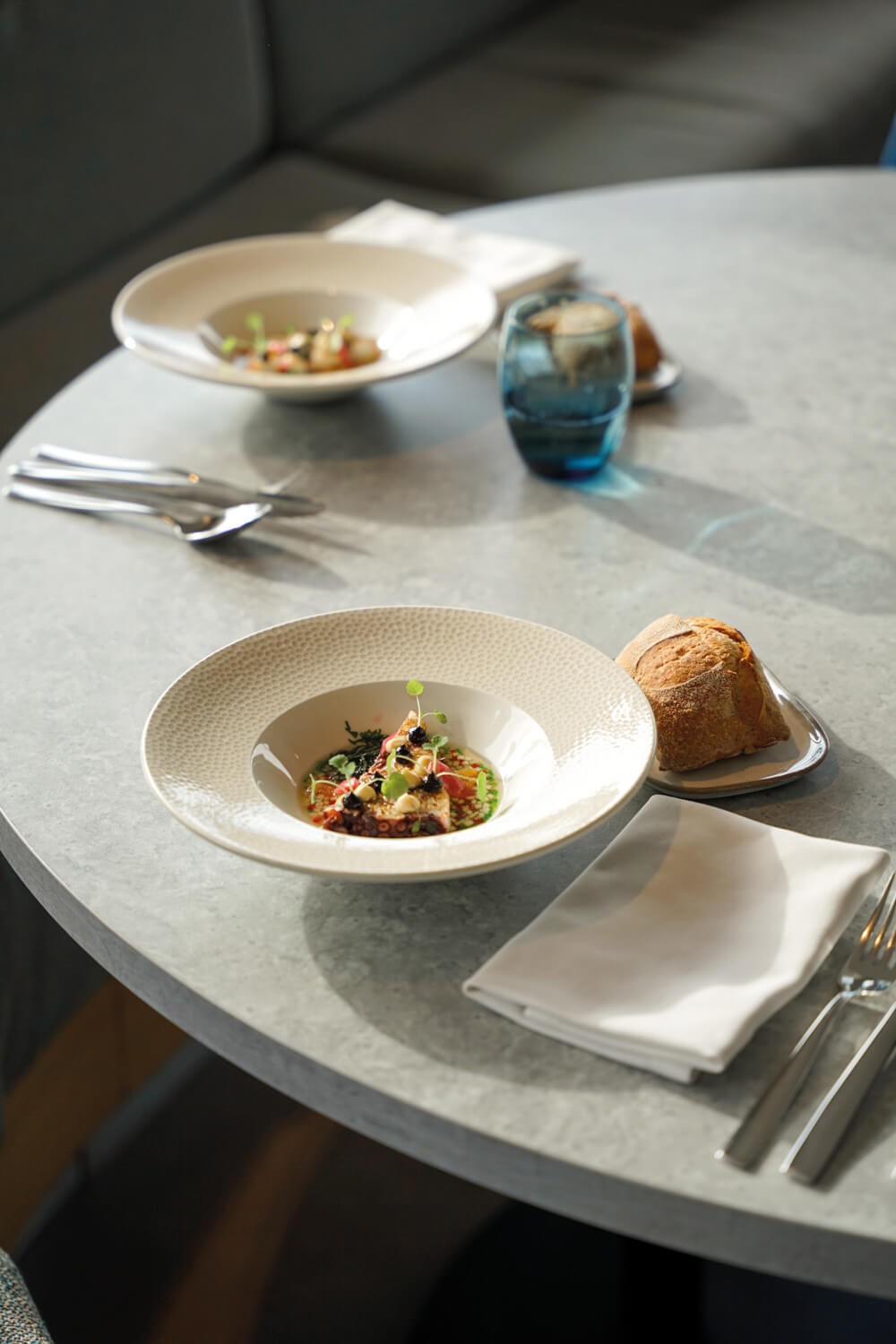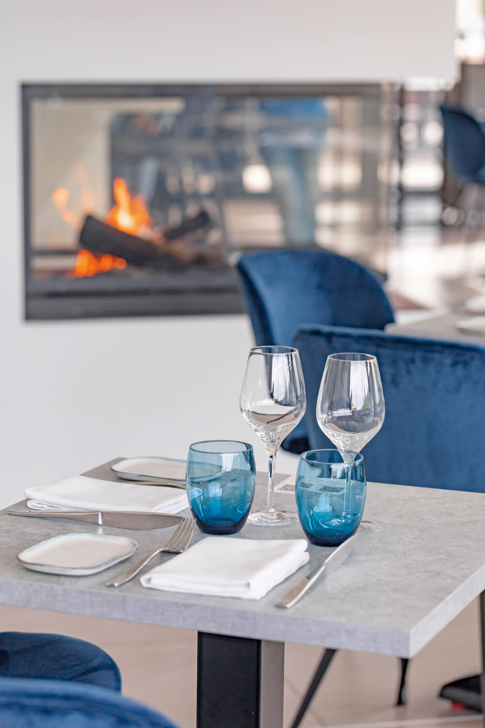 La salle de restaurant panoramique et la superbe terrasse, le tout dans une déco élégante faite de matériaux naturels et de lignes contemporaines.