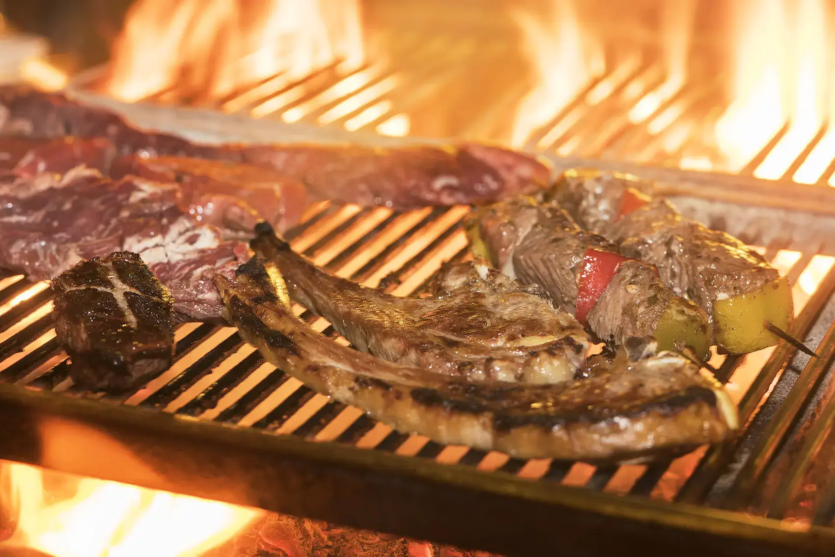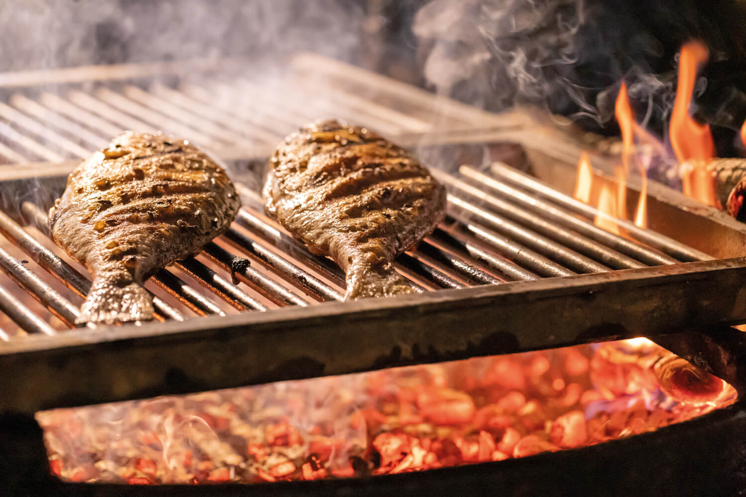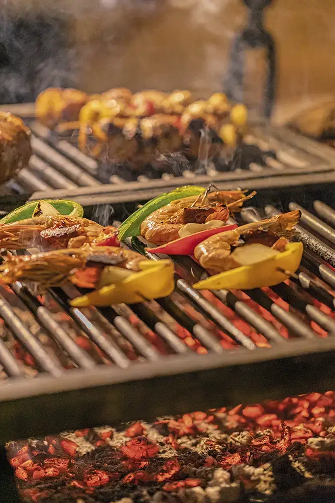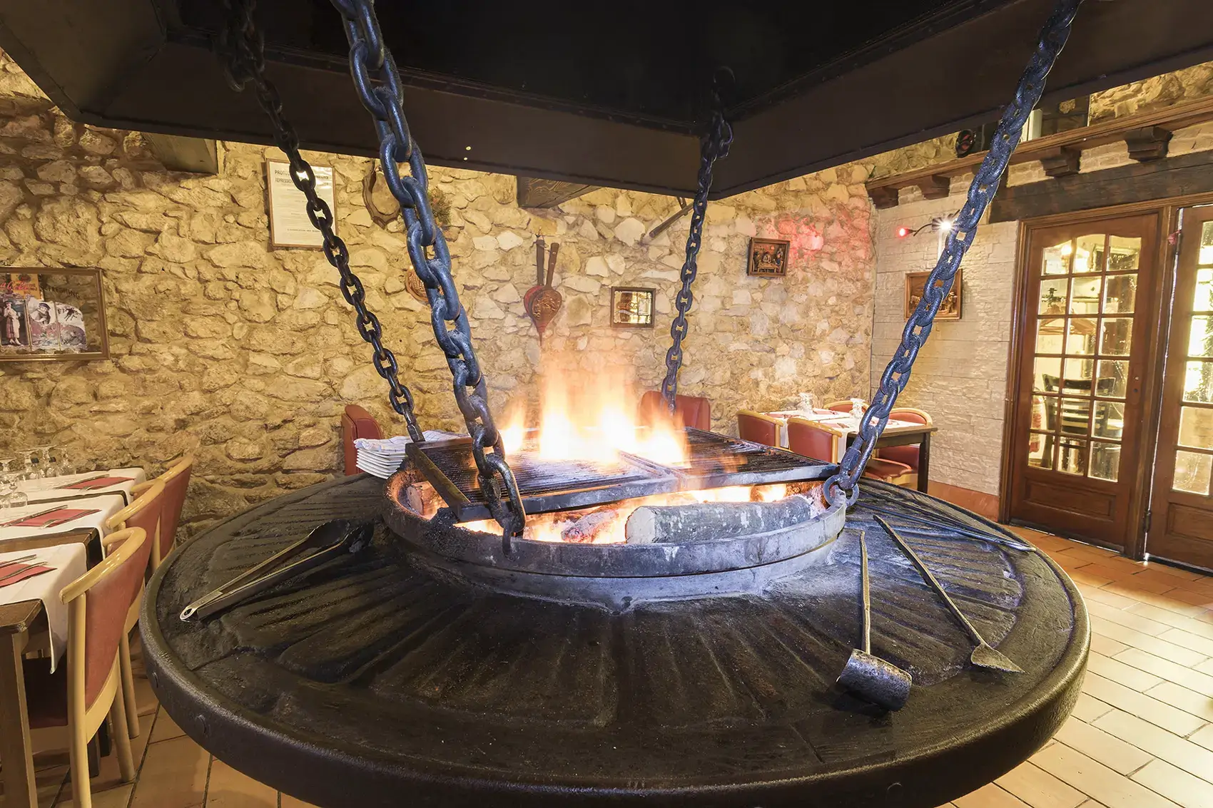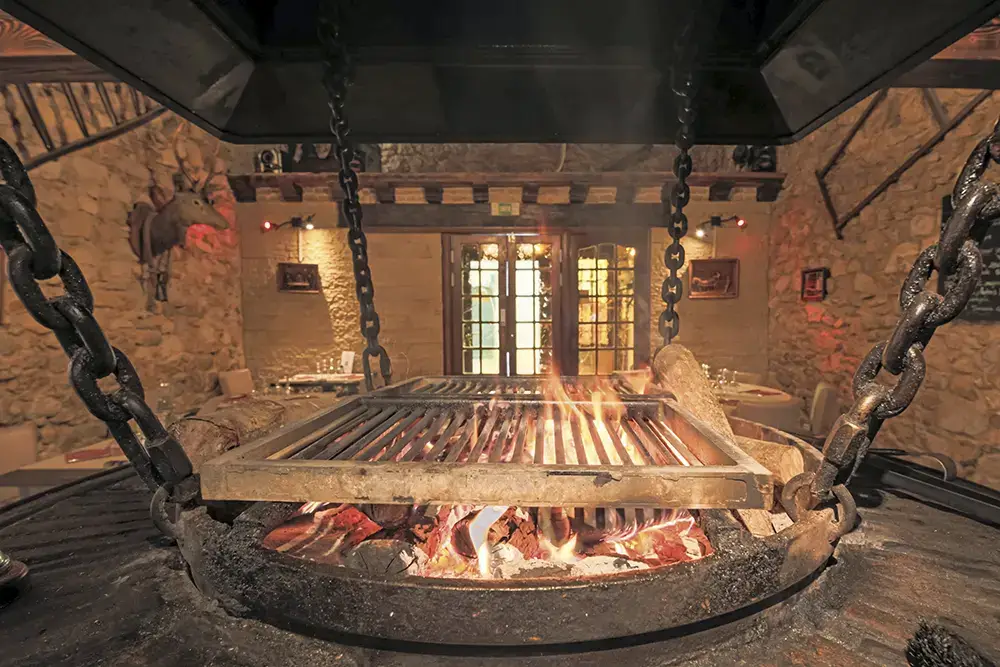 Le crépitement des braises de l’incroyable brasero suspendu dans la salle du gril, où le chef fait le show et orchestre le départ des grillades cuites à la perfection.