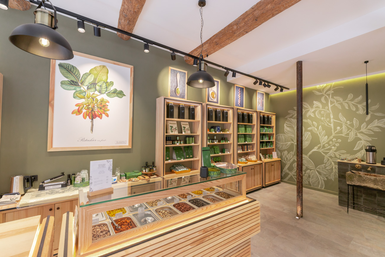 Découvrir l’univers fascinant de la pistache. Cette boutique prolonge un beau projet de réintroduction de la pistache en Provence, mis en place en 2018 par un collectif de passionnés autour d’Olivier Baussan, président du groupe Territoire de Provence. Après un premier espace à Valensole, cette nouvelle boutique, ouverte en 2025 au centre d'Aix, vous accueille pour un voyage en Méditerranée autour de la « noix qui sourit ». Les pistaches, torréfiées sur place, se dévoilent à travers un film, une carte variétale et de nombreuses spécialités à savourer ou cuisiner.