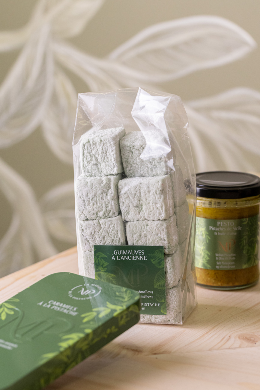 Pistaches, huiles, pâtes pures, pesto, confiseries, biscuits, éclats, poudre, farine, liqueur, thés, glaces artisanales…