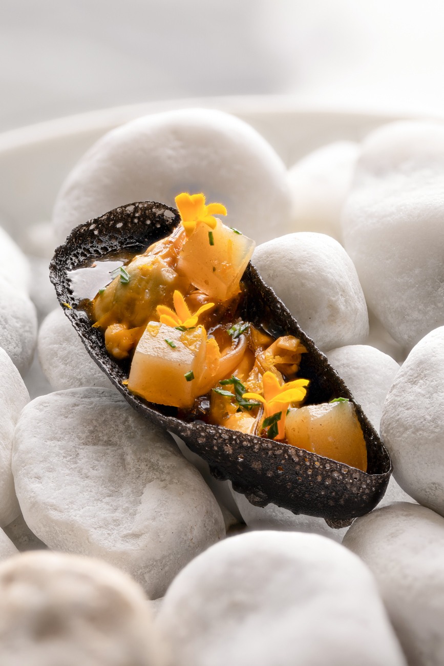 Les contrastes, accords inattendus et techniques originales qui créent l’émotion. Le flamby de foie gras, un plat signature, donne le ton.