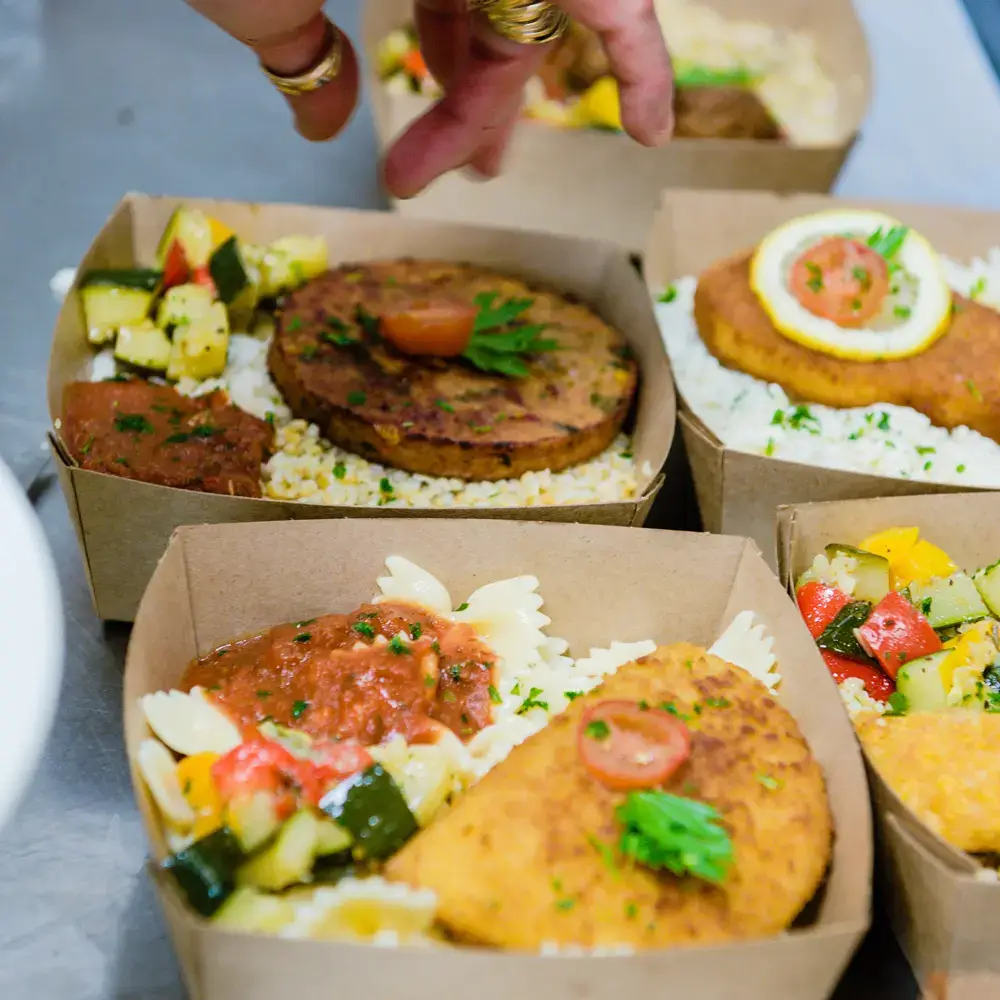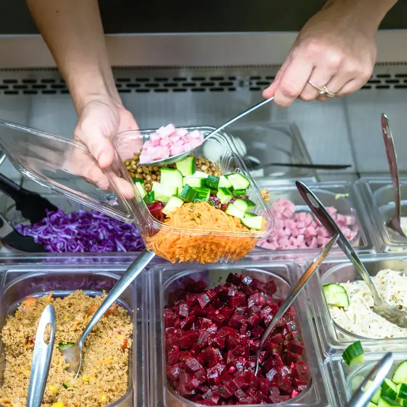 Jessica, Céline et Édith cuisinent chaque matin les plats qui vont composer les formules du jour à consommer sur place, à emporter ou livrés : plats cuisinés, tartes salées, croques, panini, poke bowls, wraps, desserts… et les bons ingrédients qui vont garnir le bar à salades.