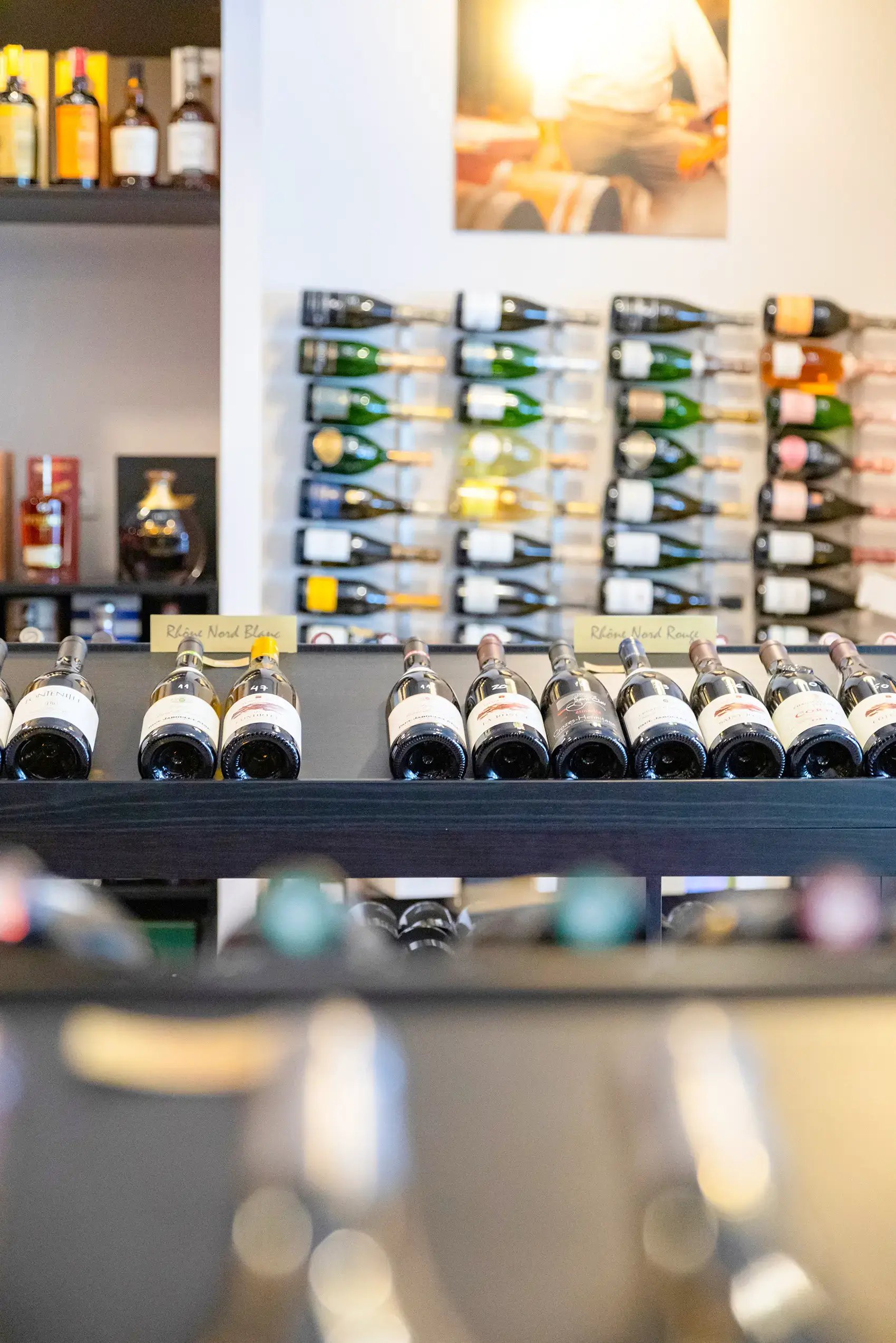 La cave Moderne et bien pensée, elle renferme des vins incontournables et des vins de petits propriétaires dont elle affiche fièrement les portraits.